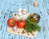 Składniki do przygotowania pomidorowego napełniania: pomidory, sól morska, papryka i pojemniki z olejem i octem
