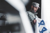 smutna kobieta na kanapie z ubrań wojskowych i foded amerykańskiej flagi w domu
