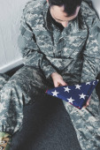 Odzież wojskowa i złożona amerykańska flaga na kanapie w domu