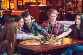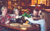 Znajomi z napojami w barze, siedzą przy drewnianym stole z piwem i pizzą