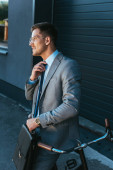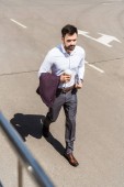 mężczyzna w okularach trzyma gazety i stoi w pobliżu samochodu na ulicy