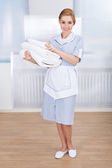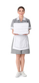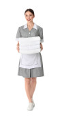 Zdjęcie "Szczęśliwa młoda pokojówka gospodarstwa ręczniki" może być wykorzystywane do celów osobistych i komercyjnych zgodnie z warunkami zakupionej licencji Royalty-free. Obraz jest dostępny do pobrania w jakości wysokiej rozdzielczości do 5760x3840.