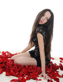 piękna dziewczyna w czarnej sukni posiada czerwona róża, siedzi na wzór co