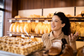 pozytywne młoda kobieta w sklepie piekarni, wybierając to, co chce przez i zamówienia do sprzedawcy