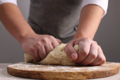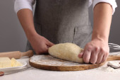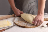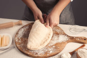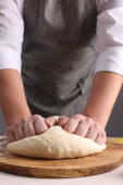 Kobieta piekarz przygotowuje chleb ciasto na stole, zbliżenie