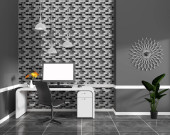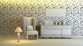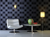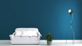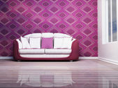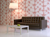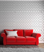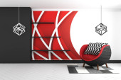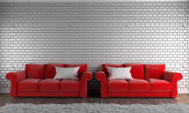 Mozaika czerwona na ścianie w salonie z czerwoną kanapą i lampką. 3d