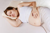 ciężarna kobieta, leżąc na kanapie przy dziecka buty.