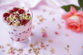 Zdjęcie "Romantyczne zdrowe śniadanie. na noc owies truskawkowy ze świeżych jagód i mięty z róży kwiatów w szklance" może być wykorzystywane do celów osobistych i komercyjnych zgodnie z warunkami zakupionej licencji Royalty-free. Obraz jest dostępny do pobrania w jakości wysokiej rozdzielczości do 5760x3840.