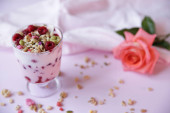 Romantyczne zdrowe śniadanie. na noc owies truskawkowy ze świeżych jagód i mięty z róży kwiatów w szklance
