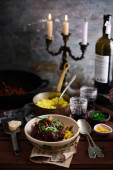 Kurczak w sosie winnym z polentą.. Styl rustykalny