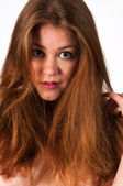 Zbliżenie portret rudowłosy kobieta z długimi włosami na niebieskim tle