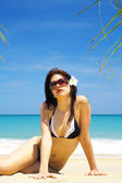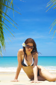 Widok na młodą miłą kobietę bawiącą się dobrze na tropikalnej plaży