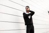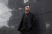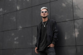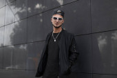 Zdjęcie "Cool Hipster młodego mężczyzny z brodą w czarnej czapce w t-shirt z okulary przeciwsłoneczne w modnej kurtki stoi w pobliżu czarnej ścianie na ulicy. Przystojny facet stylizacja modelu na zewnątrz w lecie." może być wykorzystywane do celów osobistych i komercyjnych zgodnie z warunkami zakupionej licencji Royalty-free. Obraz jest dostępny do pobrania w jakości wysokiej rozdzielczości do 5760x3840.
