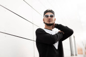 Cool Hipster młodego mężczyzny z brodą w czarnej czapce w t-shirt z okulary przeciwsłoneczne w modnej kurtki stoi w pobliżu czarnej ścianie na ulicy. Przystojny facet stylizacja modelu na zewnątrz w lecie.