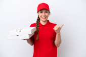 Młoda Blondynka trzyma pizzę na białym tle niebieską ścianę skierowaną w górę świetny pomysł