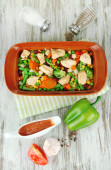 Zapiekanka z warzyw i mięsa, na tle drewniane