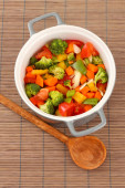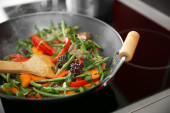 Zapiekanka z warzyw i mięsa na patelni, na tle ogień