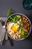 Zdjęcie "miska quinoa z jajkiem, awokado, ogórek, soczew. Zdrowe wegetarne" może być wykorzystywane do celów osobistych i komercyjnych zgodnie z warunkami zakupionej licencji Royalty-free. Obraz jest dostępny do pobrania w jakości wysokiej rozdzielczości do 5760x3840.