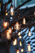 Zdjęcie "Złote żarówki na noc ciemne tło. Światła miejskie. Bo" może być wykorzystywane do celów osobistych i komercyjnych zgodnie z warunkami zakupionej licencji Royalty-free. Obraz jest dostępny do pobrania w jakości wysokiej rozdzielczości do 5760x3840.