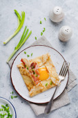 Szwajcarski Rosti ziemniaczane z kukurydzą i rakieta Sałatka podawane na szarym tle. Tradycyjne danie szwajcarskie
