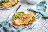 Rosti ziemniaczane z sałatką kukurydzianą i rakietą podawane na szarym tle
