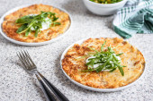 Zdjęcie "Szwajcarski Rosti ziemniaczane z kukurydzą i rakieta Sałatka podawane na szarym tle. Tradycyjne danie szwajcarskie" może być wykorzystywane do celów osobistych i komercyjnych zgodnie z warunkami zakupionej licencji Royalty-free. Obraz jest dostępny do pobrania w jakości wysokiej rozdzielczości do 5760x3840.