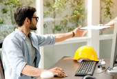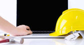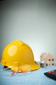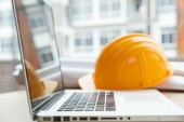 Żółta Czapka inżyniera, okulary są umieszczane na biurku z komputerem w pokoju w pobliżu okien szklanych, a także pokazać tło zielonego ogrodu lub podwórku domu lub biura.