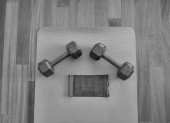 Zdjęcie "Czarno-biała wersja napowietrznych widok parę hantle, TheraBand ćwiczenia zespołów i Mata do jogi na parkiecie" może być wykorzystywane do celów osobistych i komercyjnych zgodnie z warunkami zakupionej licencji Royalty-free. Obraz jest dostępny do pobrania w jakości wysokiej rozdzielczości do 5760x3840.