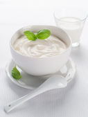 Miska świeżej kwaśnej śmietany z bazylią na białym tle