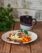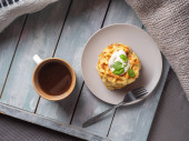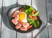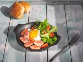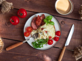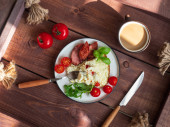 Obfite śniadanie omlet z grillowaną kiełbasą i świeże pomidory i świeże atromatous zioła, sztućce na drewnianej tacy