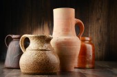 Dzbanek na wino i gliniane kubki na drewnianym stole