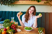 Młoda kobieta pije Smoothie i świeżą wodę w pięknym wnętrzu z zielonymi kwiatami na tle i świeżych owoców i warzyw. Koncepcja zdrowego odżywiania. Wegańskie posiłki i menu detox