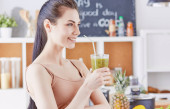 Młoda kobieta pije Smoothie w pięknym wnętrzu z zielonymi kwiatami na tle i świeżych owoców i warzyw. Koncepcja zdrowego odżywiania. Wegańskie posiłki i menu detox