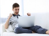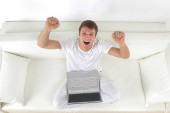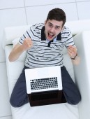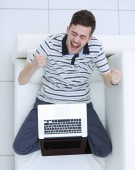 widok z góry szczęśliwy młody człowiek siedzi na kanapie i korzysta z laptopa