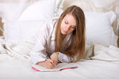 młoda kobieta leżąc na kanapie i czytanie dokumentów