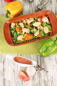 Zapiekanka z warzyw i mięsa, na białym tle