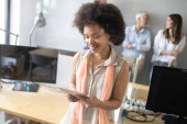 Portret atrakcyjnej młodej biznesmenki uśmiechniętej przy oknach w nowoczesnym biurze