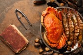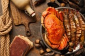 Widok z góry na talerz zieleni, surowy Krab, kokiny i małże na teksturowanej powierzchni