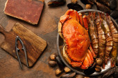 Zdjęcie "Widok z góry na talerz zieleni, surowy Krab, kokiny i małże na teksturowanej powierzchni " może być wykorzystywane do celów osobistych i komercyjnych zgodnie z warunkami zakupionej licencji Royalty-free. Obraz jest dostępny do pobrania w jakości wysokiej rozdzielczości do 5760x3840.