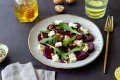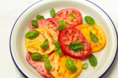Włoska Sałatka Caprese z mozzarellą i pomidorami. Tło betonowe. Zdrowa żywność.