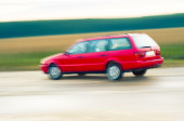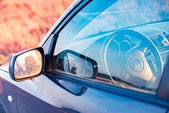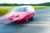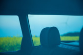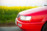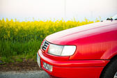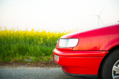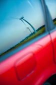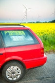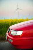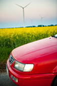 czerwony samochód stoi obok pola gdzie gwałt kwiecie. a w oddali widać turbin wiatrowych