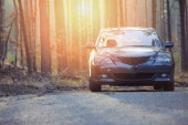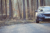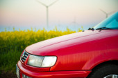 czerwony samochód stoi obok pola gdzie gwałt kwiecie. a w oddali widać turbin wiatrowych
