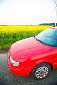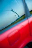 czerwony samochód stoi obok pola gdzie gwałt kwiecie. a w oddali widać turbin wiatrowych
