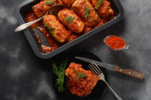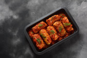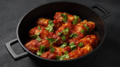 Klopsiki w słodkim i kwaśnym sosie pomidorowym z przyprawami podawane na patelni na ciemnym tle. Widok z góry