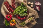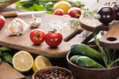 Widok z góry na talerz ze szpinakiem, czosnkiem i plasterkami pomidorów w pobliżu miski z pieprzem i solą na drewnianym stole