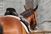 Zbliżenie skórzanego siodełka do uprawiania jeździectwa na koniu