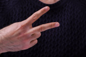 Młody mężczyzna pokazuje swoje dłonie-gest, który ma różne znaczenia w różnych krajach, z naciskiem na ręce człowieka