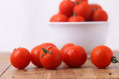 pomidory cherry leżą na jasnym drewnianej powierzchni