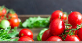 Świeże dojrzałe pomidory wiśniowe i bazylia na drewnianym tle.