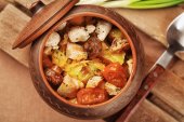 Hiszpańskie ziemniaki patatas Bravas dla Tapas z pomidorem i pikantnym sosem